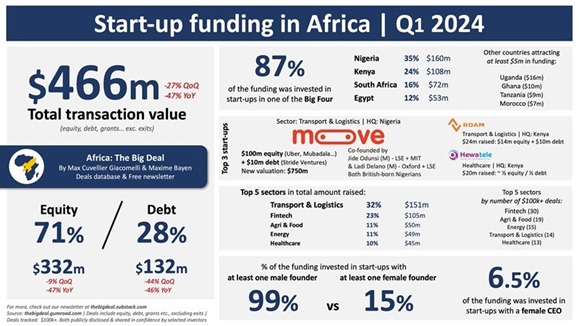 332 millions de dollars de cette mobilisation ont été levés sous forme de capitaux propres (equity), le reste sous forme de dettes, souligne le rapport. Le secteur du transport et de la logistique a, à lui seul, engrangé 32% du montant total des levées de fonds sur le premier trimestre 2024, une prouesse portée par la levée de 110 millions de dollars réalisée par la start-up nigériane Moove.